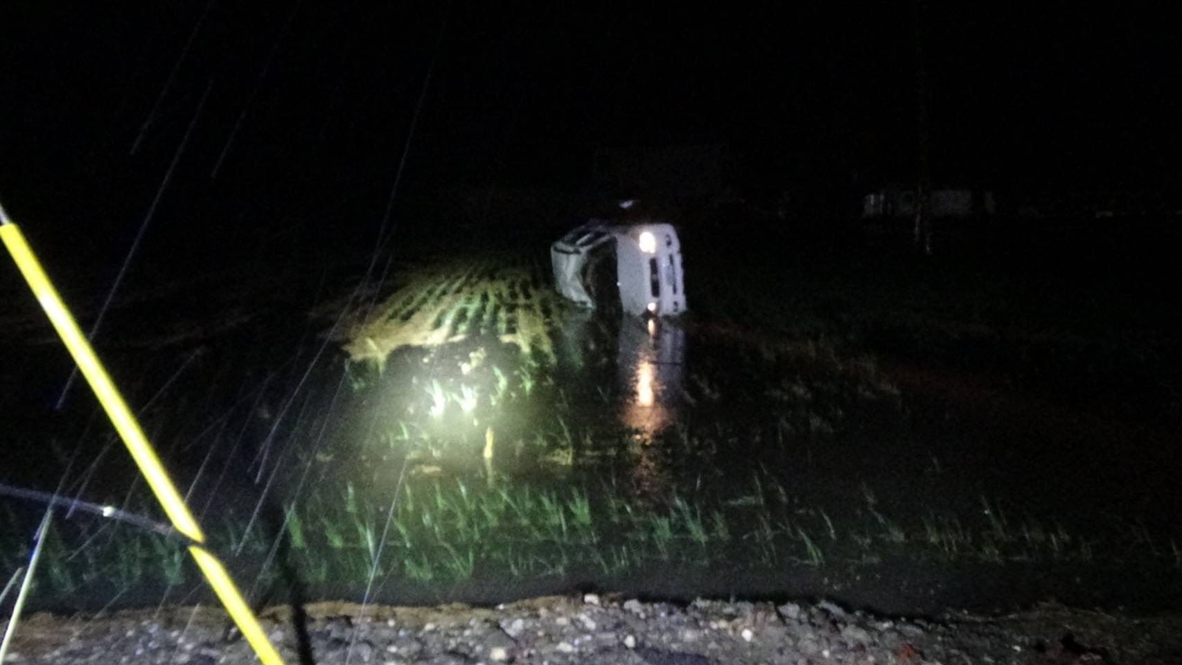 颱風夜嘉義縣布袋鎮自小客車翻落稻田中。翻攝畫面