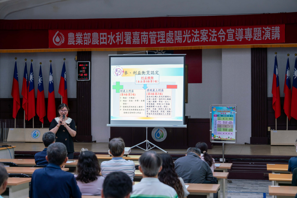 嘉南管理處表示,陽光法案透明化、公開化是政府清廉表徵,防止公務人員貪污瀆職最佳防腐劑;藉由此次宣導課程讓本處受利衝法規範及應財產申報之主管人員有所遵循,避免因不諳法令而誤觸法網。