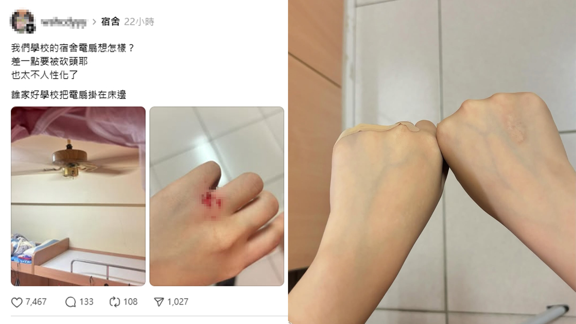 ▲宿舍電風扇成兇器!女大生嫩手被「劃傷見血」…不只1位 校方回應了(圖/翻攝自Thrrads)