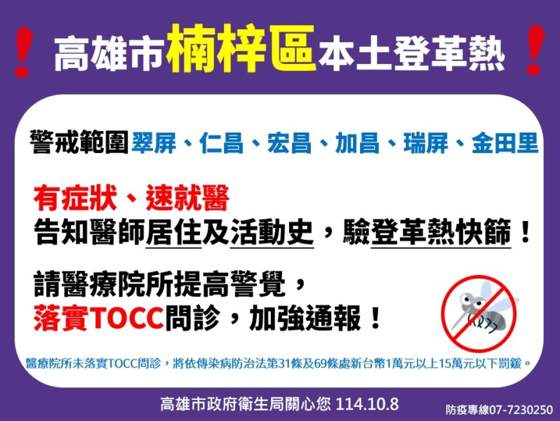 高雄市今(114)年本土登革熱疫情今(8)日於楠梓區新增1例確診個案,累積共13例。新增患者為30多歲本國籍女性,10月7日因發燒、肌肉痠痛、骨頭痛等症狀就醫,所幸診所醫師警覺現場採檢NS1快篩陽性,個案隨即住院隔離治療,今日實驗室確認為PCR陽性第一型,與日前已解除疫情警戒的鼓山區首波群聚疫情不同型別。衛生局已針對個案居住地及工作地進行擴大疫調採檢156人,截至目前尚未發現其他疑似個案。確診個案檢體將由疾病管制署進行基因定序,以進一步釐清感染源。