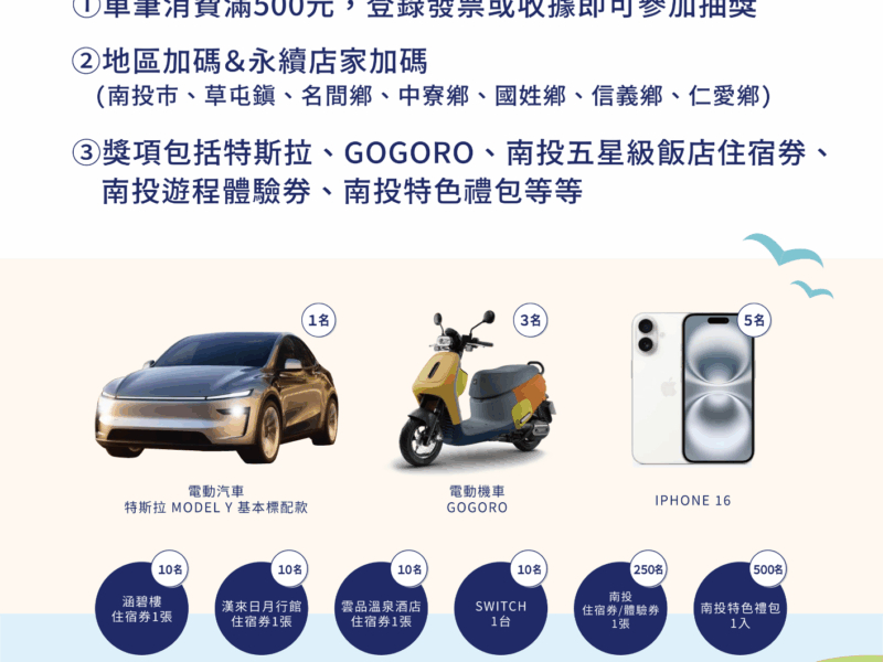 縣府觀光處指出,還沒中獎的民眾不必灰心,在11月15日前,只要在南投合法店家單筆消費滿500元,憑發票或收據即可參加抽獎,後續還有最大獎特斯拉汽車、Gogoro電動機車、iPhone、Switch、南投五星級住宿券等多項超值好禮。此外,針對旅行業者推出的團體競賽也正如火如荼進行中,9月份競賽結果將於10月20日公布,10月份的競賽也歡迎旅行業者踴躍參與,送客越多,獲得獎金的機會越大。住宿南投的團體人數還將加碼計算,最高名次團體可獲得高達25萬元的獎金。