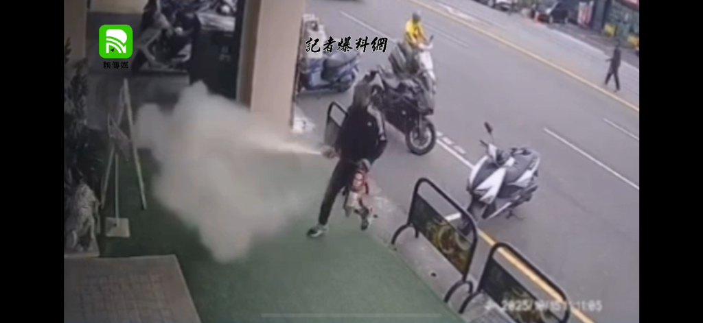 警方表示,案發時間約為11時15分,根據監視畫面顯示,三名男子持滅火器對店門口狂噴白色粉末,造成店面及看板嚴重受損,隨後搭乘一輛白色汽車迅速離開現場。