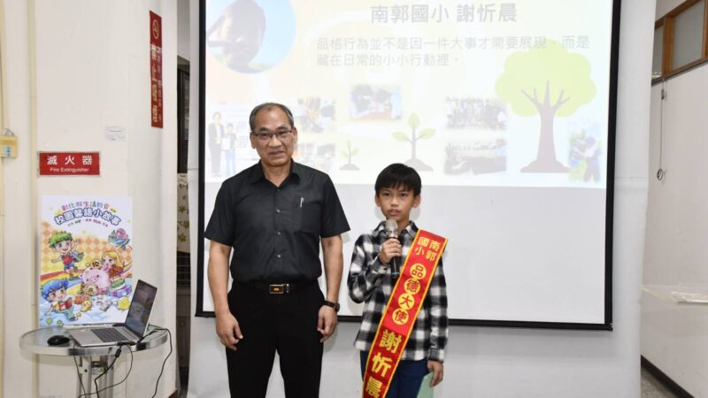 南郭國小品德大使謝忻晨表示,很開心能被推薦成為品德大使,感謝老師、同學和家人的鼓勵與支持,在學習過程中,總要求自己做到最好,希望能把這份能量傳遞給每一個人。另外,也重視幫助別人,在學校利用時間陪伴特教同學;參加一年級新生的志工服務,陪伴他們用餐,讓他們更快適應新環境。在家庭裡,主動幫忙家務和幫助阿公的農事,也陪伴弟弟學習、教導生活作息。這些經驗能體會到幫助別人其實是讓自己變得更有力量,相信品德行為並不是因一件大事需要表現,而是藏在日常的小小行動裡。未來會繼續保持謙虛、努力學習,並抱著善良與無私的心,從小事做起,把正向能量傳遞給更多人。