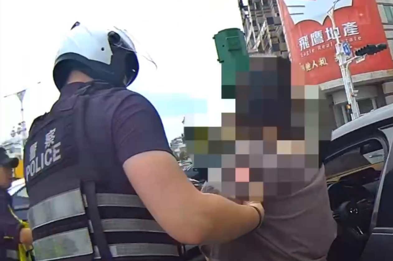 警方將駕車自撞女子扶出車外。翻攝畫面