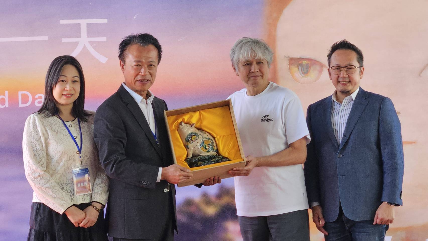 開幕現場,翁章梁致贈由文化部認定、文化資產傳統藝術技術保存者林洸沂製作的「快樂豬交趾陶」,作為豬年出生的奈良美智生日禮物,象徵嘉義在地文化與國際藝術的再次握手。
