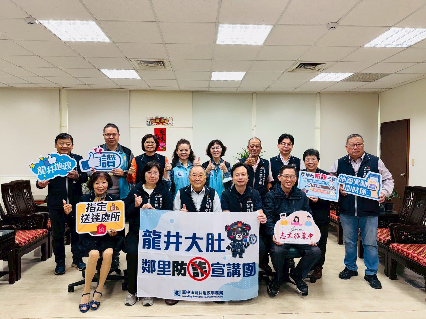 為提升民眾識詐能力並降低不動產詐騙風險,台中市龍井地政事務所攜手龍井區調解委員會,除向調解委員宣講「地政防詐三寶」包含地籍異動即時通、住址隱匿及指定送達處所等相關措施,並於現場協助委員完成申辦作業,更期盼借重委員第一線接觸民眾的優勢,普及防詐觀念,合力守護里民產權安全。