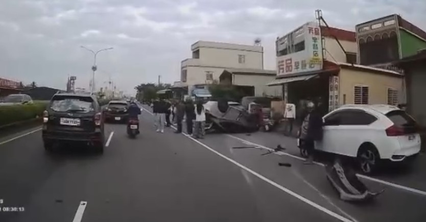 自小客車撞分隔島翻覆再撞路邊3輛車。翻攝畫面