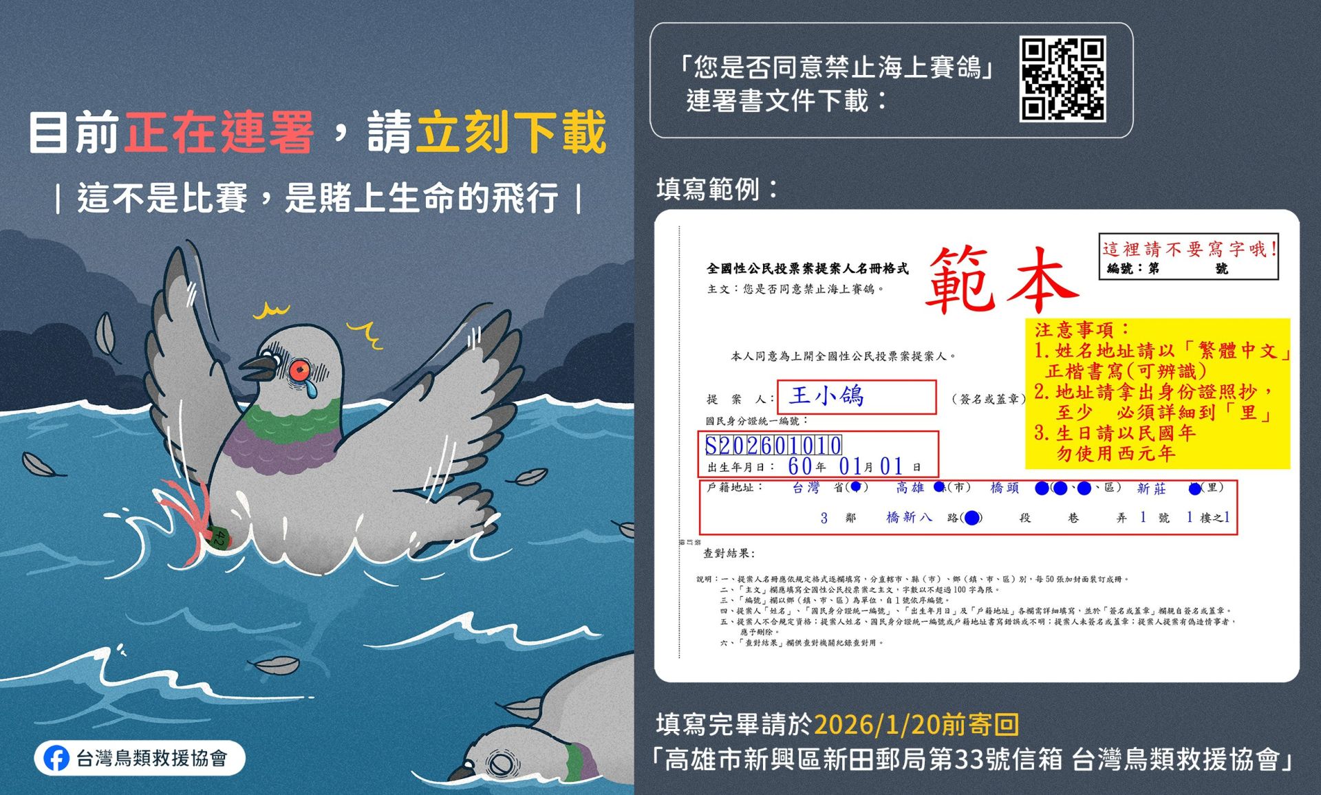 台灣鳥類救援協會也呼籲全台民眾參與連署,讓禁止海上賽鴿的議題能正式進入公民投票程序。此次連署時間緊迫,協會目標在 2026年1月20日 前彙整所有連署書送件。