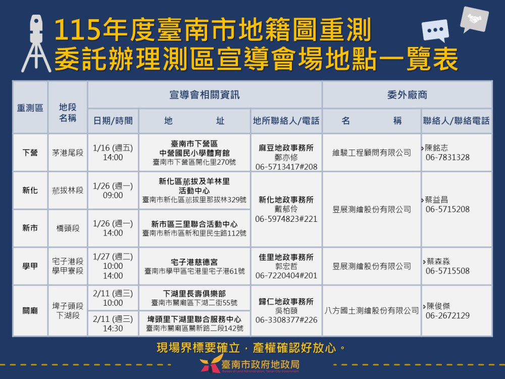 【大成報記者杜忠聰/臺南報導】為讓重測區土地所有權人充分瞭解作業內容與權益,臺南市政府地政局自 115 年 1 月 16 日起,陸續舉辦 5 場「115 年度臺南市地籍圖重測作業宣導會」,誠邀民眾踴躍參加,助力重測作業順利推進。