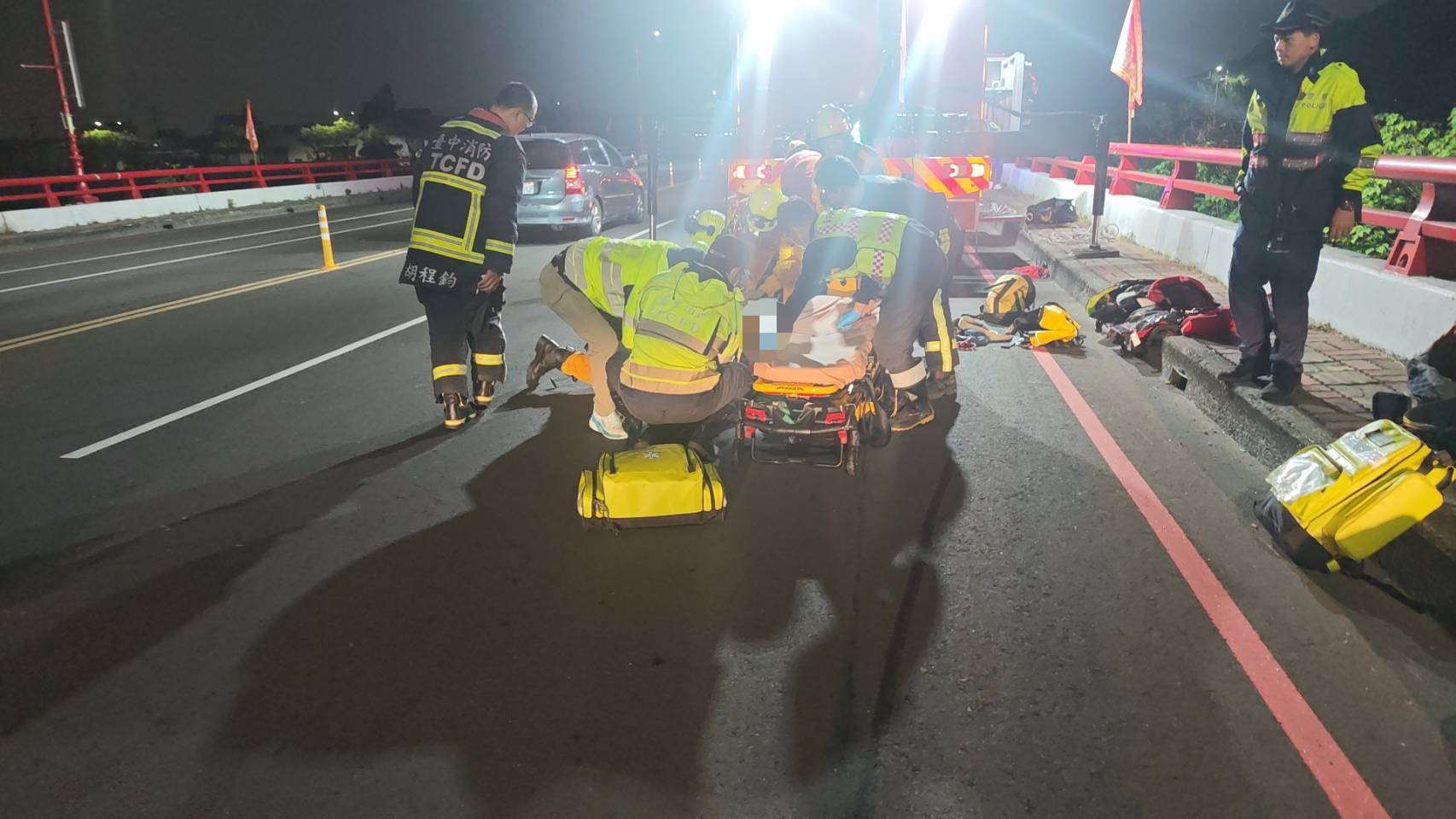 消防隊員於20時06分到達現場,20時22分發現墜橋女性意識不清,20時42分將傷患吊掛至橋面,處置後送往國軍803醫院救治。