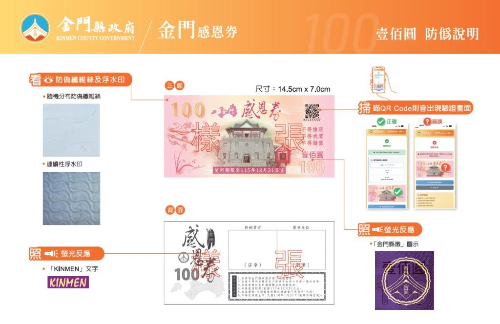 金門縣府說明,感恩券分100元、500、1000元3種面額,券正面皆有金門島、莒光樓、金門特色電話亭圖示以及感恩券字樣,背面則皆有縣徽及金門感恩券字樣;100元面額為粉紅色;500元面額為黃棕色;1000元面額為紫藍色。