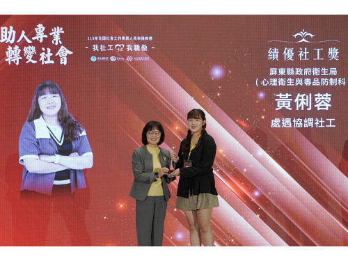 除了整體績效表現亮眼,在專業人才培育上更締造豐碩成果。衛生局心理衛生中心心理師鐘裕燕榮獲第一屆「十大生命救援獎」,並獲總統親自接見鼓勵;家暴性侵處遇督導黃俐蓉獲頒衛福部「全國社會工作專業人員績優社工獎」;心衛中心督導陳怡君亦入圍南高屏地區「社會工作專業人員保護服務獎」,這些殊榮不僅是對個人的肯定,更是屏東整體社安與心衛專業實力的最佳證明。