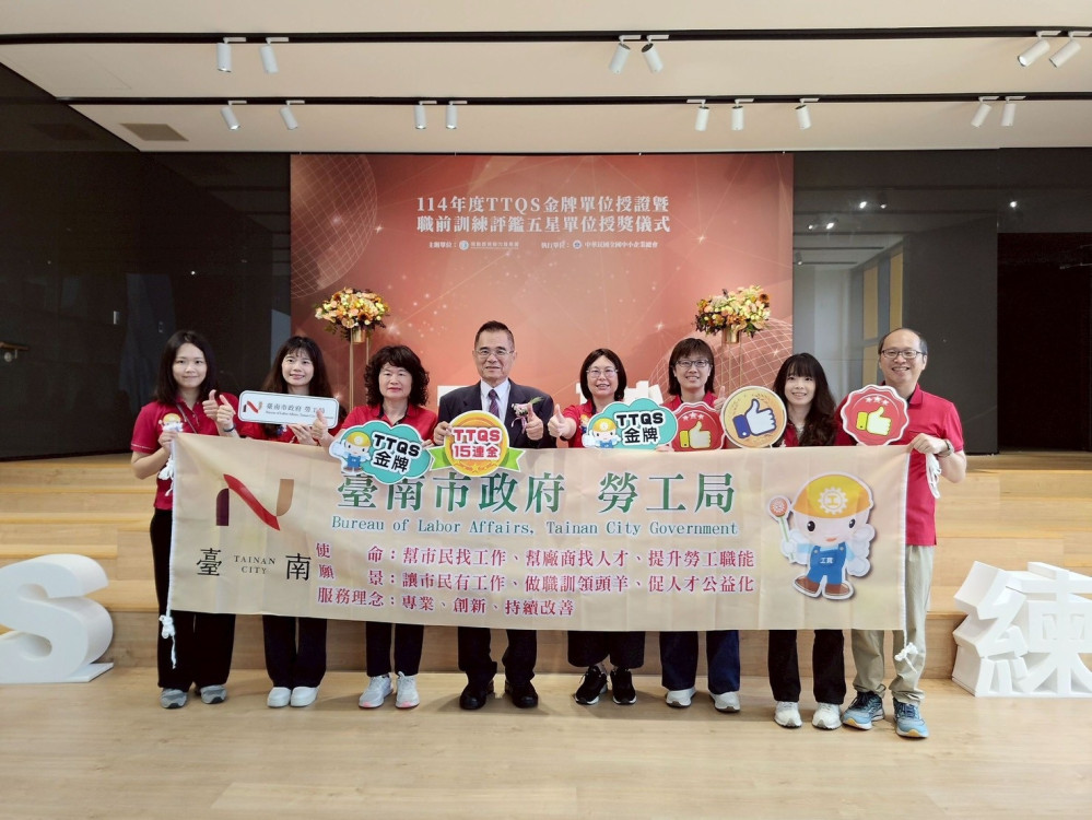 【大成報記者杜忠聰/臺南報導】為實踐黃偉哲市長「希望家園」施政願景,臺南市政府勞工局持續推動多元職業訓練課程,強化勞工職能培育並擴大訓練效益,同時攜手大台南總工會促進工會及勞工多元發展,展現斜槓人才價值。雙雙榮獲「114年度人才發展品質管理系統(TTQS)評核」金牌肯定,並於21日北上至國立政治大學公企中心國際會議廳接受授證。