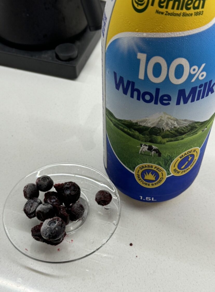 原PO指出,「最近迷上藍莓牛奶,但買外面打好的真的太貴,一杯都要100起」,因此改為自行動手,從成本角度來看,整體採購金額約500元,「可以打超多杯」,製作過程僅需「藍莓一小盤+牛奶250cc」,放入果汁機攪打即可完成,過程簡單到「完全不用技術含量。」